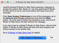 When you start R-Studio for the first time on macOS High Sierra and higher, a System Extension Blocked warning message will appear.
