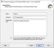 | 3 | Enter your license key to register your copy of the R-Studio Emergency Startup Media Creator and click the Next button. |