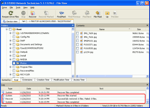 7. Una vez finalizada la recuperación, R-Studio mostrará los resultados en el registro.