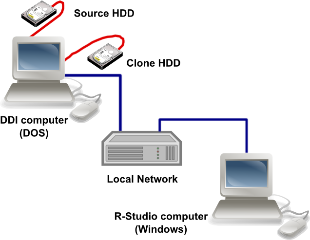 La tarjeta DDI se debe instalar en un equipo de red diferente (llamémoslo el equipo DDI ), al que debemos conectar el disco de origen y el disco clonado. El equipo DDI se debe iniciar usando el dispositivo de arranque USB que acompaña la tarjeta DDI. R-Studio que se ejecuta en otro equipo (llamémoslo el equipo R-Studio ) accede al disco a través de la red. Todas las operaciones de recuperación de datos se harán con esta configuración: