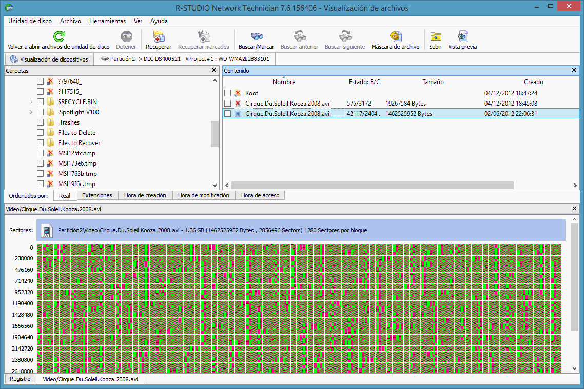 | > | Los sectores del archivo serán clonados y R-Studio mostrará su estado en el panel Contenido . |