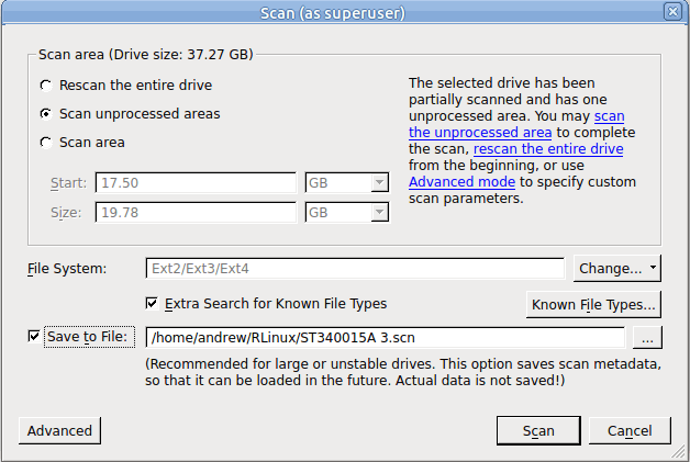 You may rescan the entire disk, scan unscanned areas, or scan an explicitly specified area.