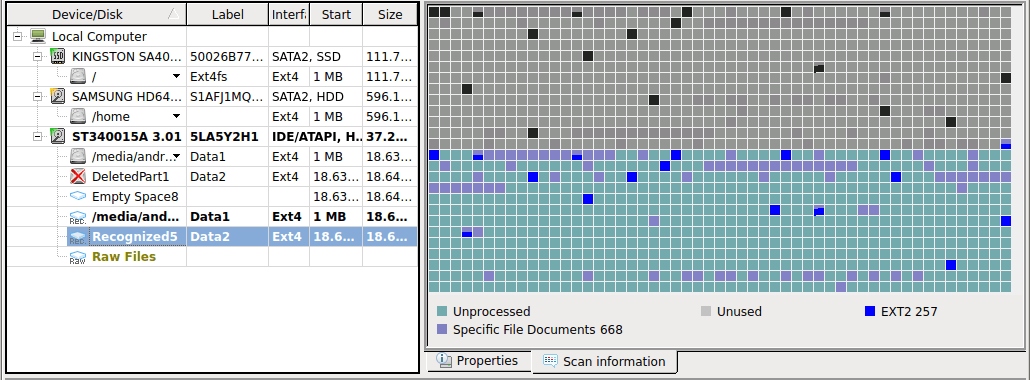 When an object is scanned, a number of Recognized partitions will appear. R-Linux shows them in different colors depending on which elements of the partition have been found.